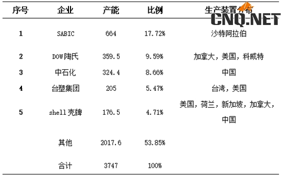 中东主要是气头,北美亚洲主要是油头。全球第一大公司即为沙特SABIC,拥有664万吨乙二醇产能,主要装置分布在沙特阿拉伯。其次为陶氏,中石化,台塑,壳牌等。前五大企业共占据46%的产能。