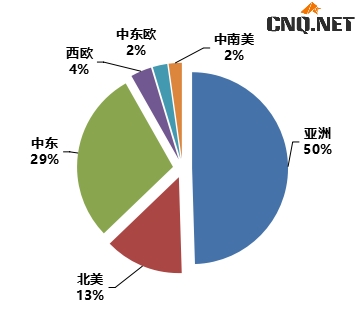 从地域上来看,截止2016年,全球主要的乙二醇产能也集中在亚洲,中东,北美三地,其中亚洲占比1855.7万吨,占比50%,北美498万吨,占比13%,中东1086万吨,占比29%。