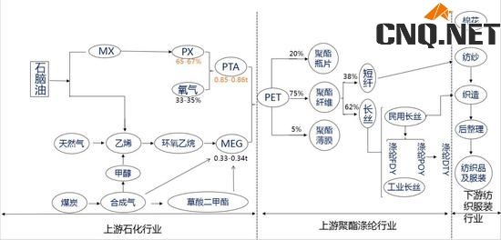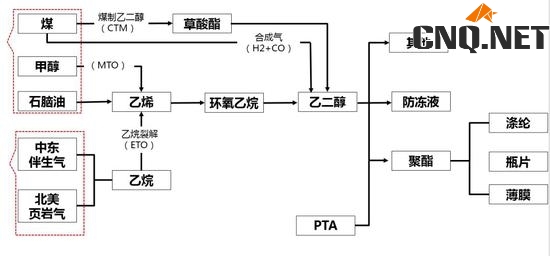 乙二醇主要应用于聚酯的制造,因此其产业属于聚酯产业链的一个部分,乙二醇主要归属于聚酯产业链中的上游石化行业。当然,随着国内煤化工的发展,煤制乙二醇目前也开始进入聚酯市场,根据不完全统计目前聚酯行业中使用煤制的比例在25-30%。聚酯行业主要为纤维和瓶片,终端运用领域主要为纺织服装和饮料、片材,基本于衣食住行基本需求息息相关。因此两者的周期性并不明显,而对应乙二醇的需求也相对较为稳定。