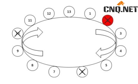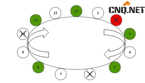 第三步:利用13÷5=2余3,根据余数3从起点开始剔除3手卖方期权持仓,剔除间距为13÷3的商4。剔除后形成的序列如图3所示。