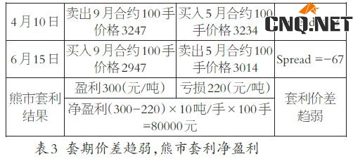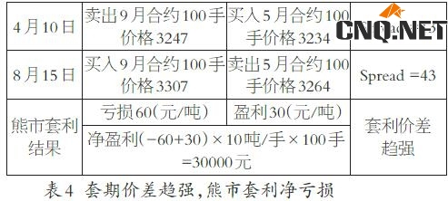 以上仅例证了反向市场上熊市套利在套期价差趋弱时盈利,套利价差趋强时亏损。同理在正向市场上也可以得出相同结论。