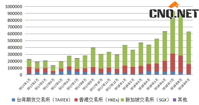 以2018年11月1日为例:港交所交易的合约有2018年11月、12月,2019年1月、2月、3月、6月、9月、12月以及2020年3月和6月;新交所上市的合约有2018年11月、12月,2019年全部12个月份,2020年3月、6月、9月和12月,2021年3月、6月和9月;台期所交易的合约仅2018年11月、12月,2019年3月、6月、9月和12月。