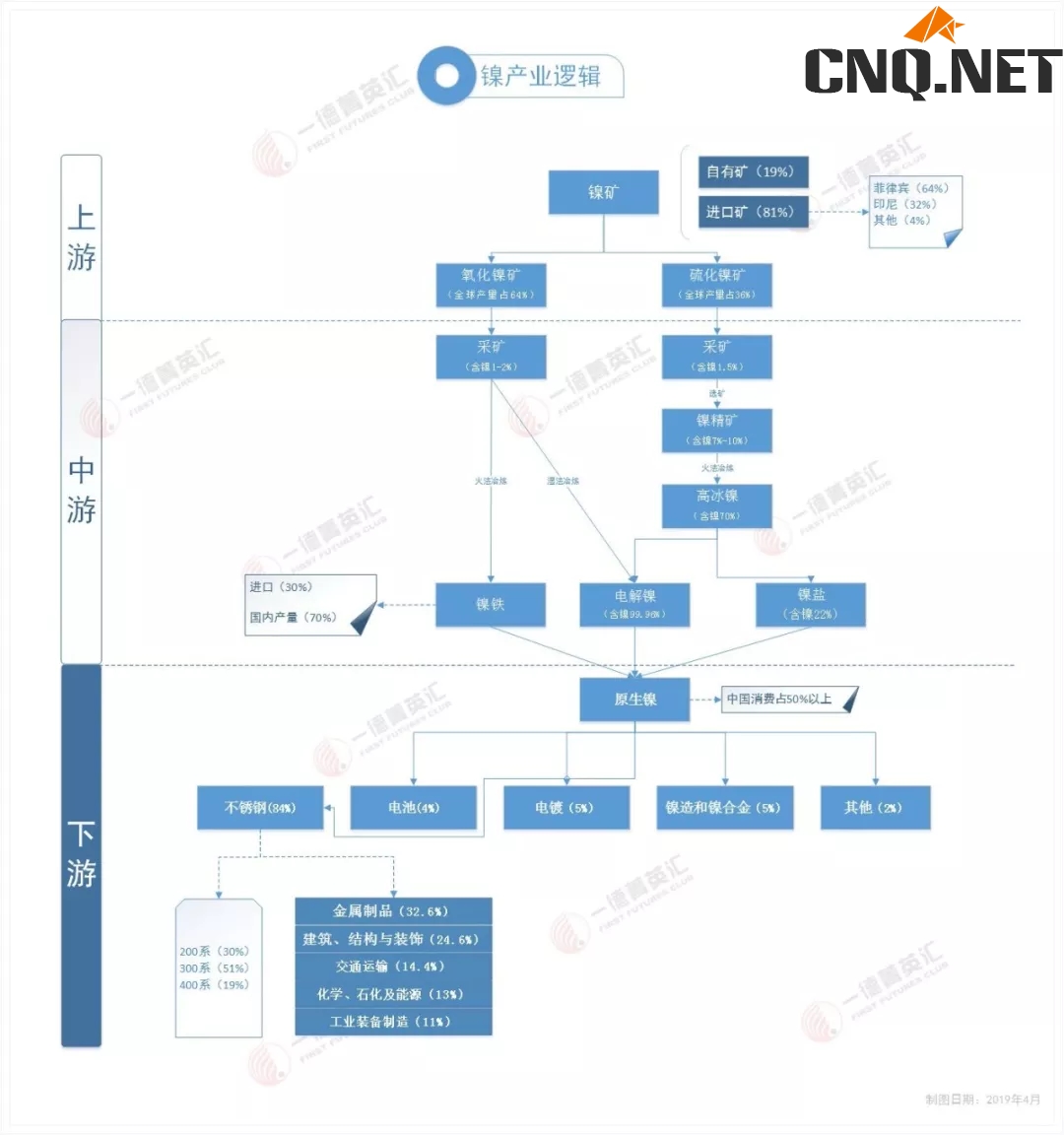镍是重要的工业金属,广泛运用于钢铁工业、机械工业、建筑业和化学工 业。具体的用途包括:第一、用作金属材料,包括制作不锈钢、耐热合金钢和各 种合金;第二、用于电镀,在钢材及其他金属材料的基体上覆盖一层耐用、耐腐 蚀的表面层;第三、在石油化工的氢化过程中用作催化剂;第四、用作化学电 源,制作镍氢电池、镍镉电池的原料;第五、制作颜料和染料,制作陶瓷和铁素 体等新型材料。镍按照生产原料的不同可分为原生镍和再生镍,原生镍的生产原料来自于 镍矿,再生镍的生产原料来自于含镍废料。按照镍金属的含量,原生镍可以分为 四大产品系列,分别是电解镍、含镍生铁、镍铁、其它(镍盐、通用镍等)。