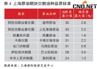 上海原油期货交割油种规定的基准品质为API度32,含硫量1.5%,并在此基础上对每个油种规定了API最小值和含硫量最大值。