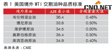 对交割油种的品质标准方面,对美国境内原油要求API度在37-42之间,含硫量不超过0.42%;对境外原油每个油种规定API最小值和含硫量最大值。