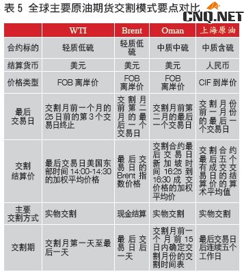 从上述介绍可以看出,每个原油期货合约均有各自的特点。上海原油期货从合约标的、价格类型、交割方式、交割结算价等多个方面与WTI、Brent、Oman的交割模式都有所区别。为方便比较,WTI、Brent、Oman及上海原油期货交割模式要点对比如下,见表5。
