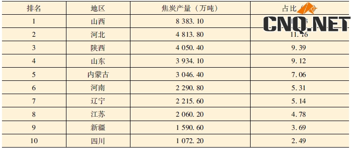 表 2017年中国焦炭生产排名前十位省份产量、占全国比重