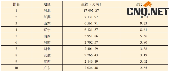 表 2017年中国生铁生产排名前十位省份产量、占全国比重