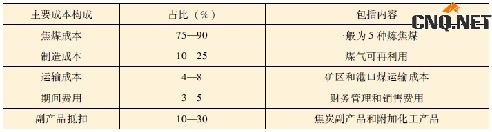 焦炉煤气、煤焦油、粗苯现在已成为焦化厂的“三大宝贝”。这三大宝贝来自炼焦煤在隔绝空气高温加热、达到熔融状态时裂解所产生的焦化副产品。其中可回收利用且价值较高的就是焦炉煤气、煤焦油、粗苯。一般每生产出1吨焦炭需要1.32—1.45吨的炼焦煤,同时可产出400立方米左右的焦炉煤气、大约46千克的煤焦油及12.5千克上下的粗苯,焦炭副产品及附加化工产品对生产成本的抵扣达到10%—30%(见下表)。