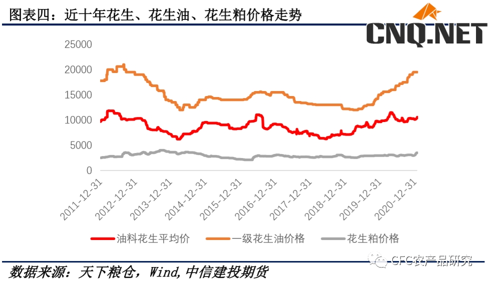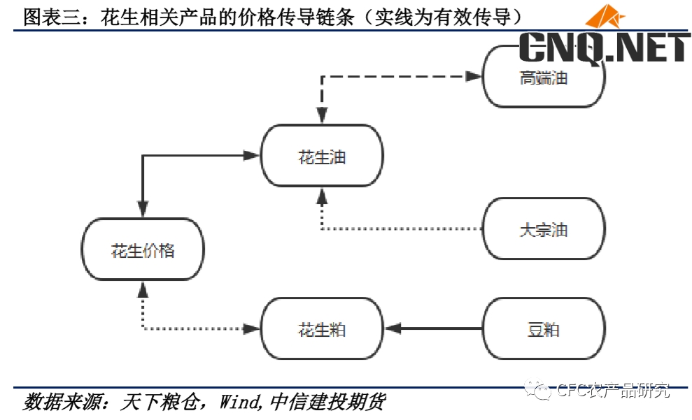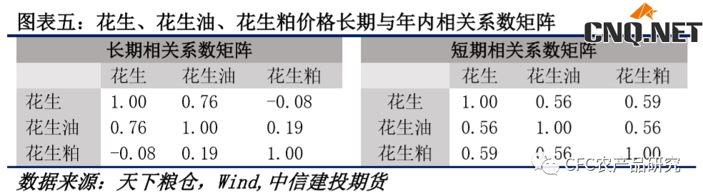 从花生价格、花生油价格以及花生粕价格的相关性来看,花生价格与花生油价格波动具有较大的一致性,而与花生粕之间的关联并不明显。花生压榨的主要产品是花生油,花生粕只是附属产品。