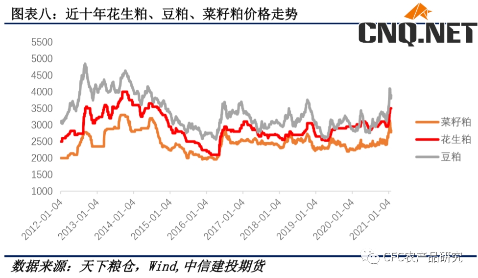 这主要是由于在饲料应用中花生粕、豆粕和菜粕在特定配方中能够被及时调换,一旦出现价差明显超出实际饲养效果的差距,那么就能够刺激饲料企业和养殖企业调整饲料配方,使得价差重新收拢。
