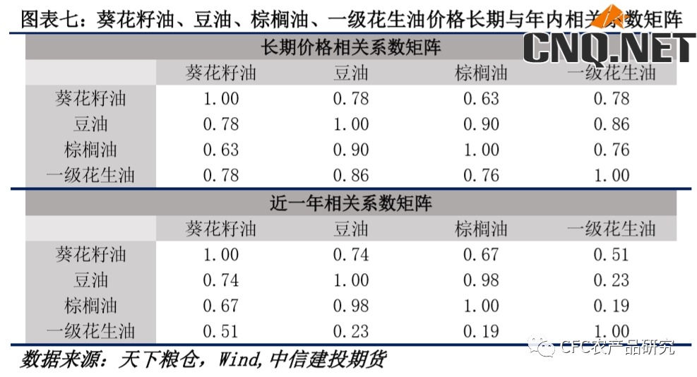 短期来看,由于不同油脂具有不同的应用场景,其价格相关性并没有那么显著。花生油与葵花籽油在家庭食用方面具有较高一致性,其短期相关系数较高;而棕榈油与豆油作为大宗油脂,消费场景更加广泛,其与花生油价格在短期的相关性大打折扣。