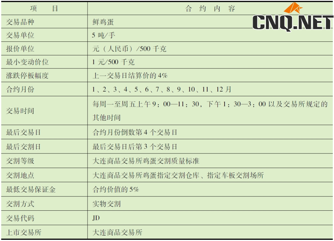 鸡蛋期货合约交易单位为5吨/手,主要原因是:小养殖户的养殖量普遍在1万只左右,每天的产量约为500千克,10天的产量约为5吨;考虑到未来10万只鸡的养殖场将是我国规模化养殖的主流水平,5吨的标准相当于一天的产量。因此,将合约单位设计为5吨有助于促进行业规模和养殖水平的提升。还有,该合约规模与玉米、豆粕等相关品种接近,投资者可以方便地建立鸡蛋、玉米、豆粕的“饲料原料+最终产品”的养殖套利操作模式,便于机构投资者有效参与,有助于鸡蛋期货价格发现功能的实现。