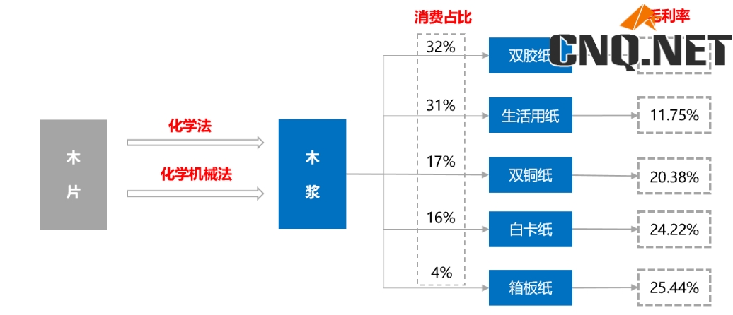 在木浆消费结构中,双胶纸与生活用纸占比均为32%,其次是双铜纸与白卡纸占比分别为17%、16%,箱板纸多以废纸为原材料,木浆消费占比仅为4%。