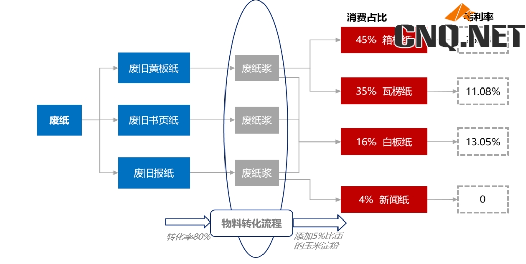 利用废纸生产出箱板/瓦楞/白板/新闻纸,主要供给下游包装需求;纸浆系以木浆为原料,其中2/3为进口木浆,1/3为自给浆,生产以铜版/双胶纸为主的文化纸原纸,用于书刊、杂志的印刷需求。