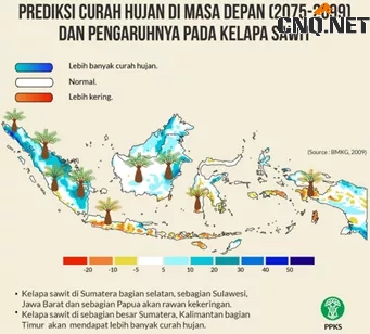 气候的变化对棕榈油产业也是个很大的问题存在,直接的影响就是单产降低。原因是降雨量不均匀,一部分区域降雨量特别大,对棕榈树种植成长条件不好,另一部分降雨量越来越少,导致干旱,对棕榈树种植成长条件也不好。可见以下未来印尼降雨预测图,苏门答腊南部、苏拉维西、西爪哇、巴布亚会比较干旱。而苏门答腊岛大部分、东加里曼丹降雨量会比较大。西、南、中加里曼丹可能还好,不会有太极端的天气所在。