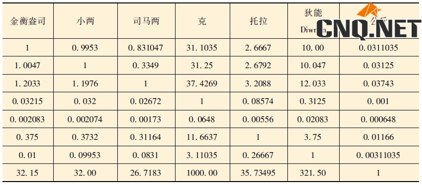 中国黄金市场以公制克为计量单位。中国传统计量黄金采用的单位是“小两”,1斤=16小两,1小两等于31.25克。中国人民银行已明文取消了此种计量方式。香港和广东地区采用“司马两”,一司马两为37.5克,目前香港金银贸易市场仍采用此种计量方式。而欧美用金衡盎司、埃及用狄能、印度用拖拉,但国际金融市场上多以金衡盎司为计算单位,它们之间的换算见下表。