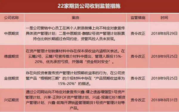 据券商中国记者不完全统计,2018年共有22家期货公司(包括营业部)收到了25份监管措施,其中20份被采取责令改正、5份被出具警示函的监管措施。